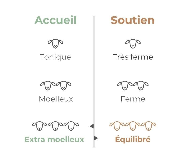 Plongez dans le bien-être avec un confort équilibré et un accueil extra moelleux pour une relaxation ultime. Le surmatelas en laine vierge française assure une qualité supérieure, tandis que l'enveloppe en coton biologique renforce le caractère naturel et sain de votre espace de sommeil.